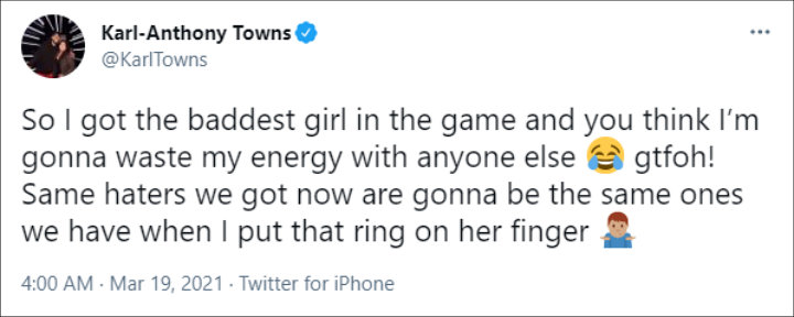 19th March 2021 1445 IST Karl Anthony-Towns Lady-love Jordyn Woods Shoots Down Cheating Rumours Slams Netizens NBA player Karl Anthony-Towns girlfriend on Friday took to her social media handle to deny allegations that. The social media star has been dating NBA player Karl-Anthony Towns since last yearHowever this week the. Jordyn Woods Karl-Anthony Towns The woman accused of coming between Jordyn and Karl.
